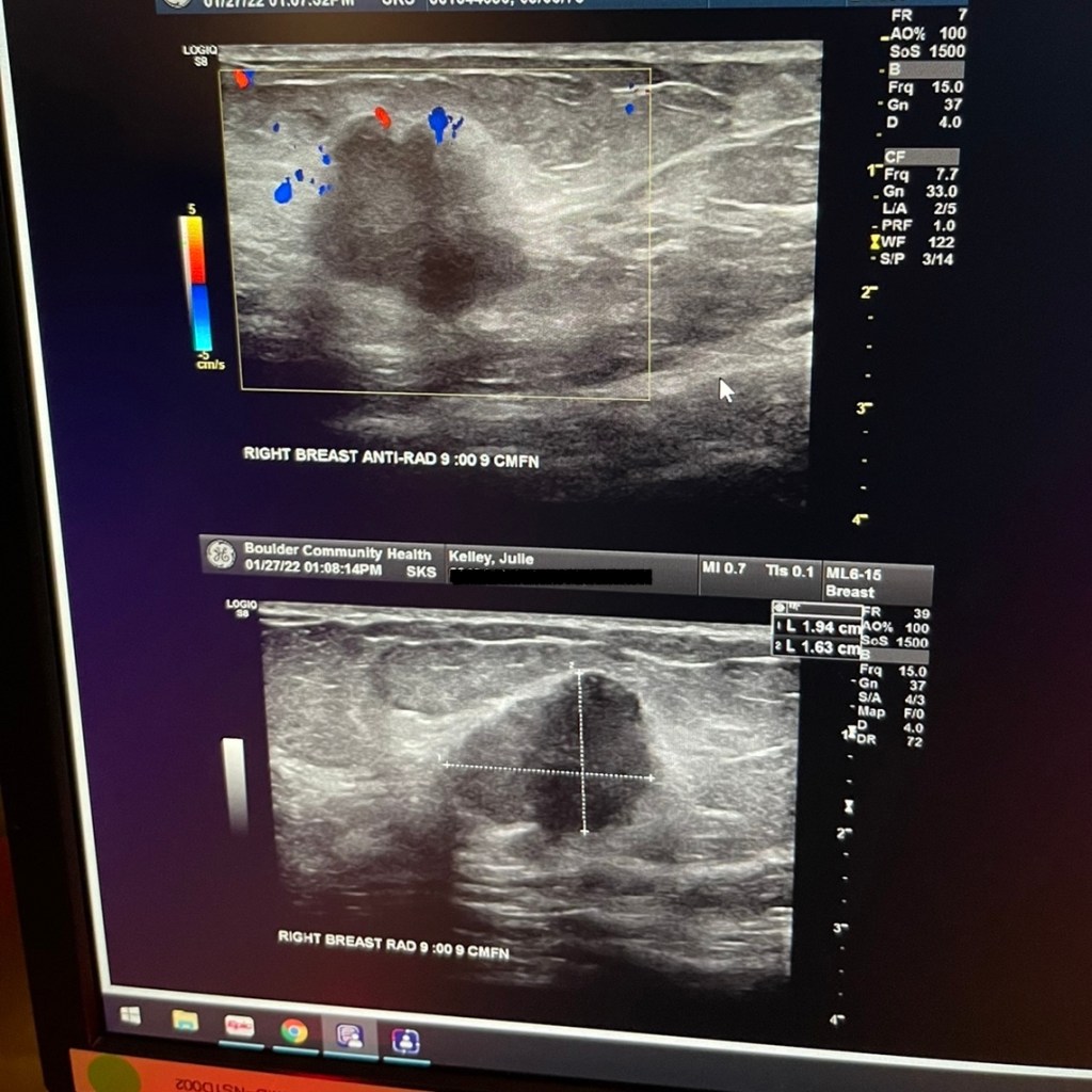 Nanna suggested I take an Ativan or Valium for this procedure. Dr. Helgans was performing the biopsy, and he was so kind. Donna, the nurse, ran the machine, held my hand, and talked to me about her new grandbaby she would visit next week. We started talking about babies & birth (one of my favorite topics). Then the Marshall Fire came up, and everyone shared how close they were to it or knew someone who was impacted. I told them that I live less than a mile from where it started and that our condo is all wood, including the walkways and the pine trees drop so many dry needles that our home is a matchstick (not to mention all the dry open space right behind us). Except I called them pineapples instead of pine needles. Dr. Helgans laughed and felt confident the Ativan had kicked in at that point.
